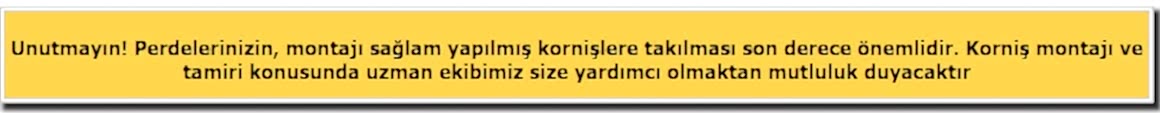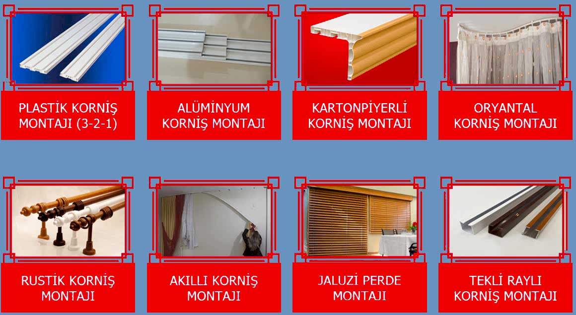 Evinize en çok yakışacak perdeyi seçtikten sonra gerisini profesyonellere bırakın. Yılların deneyimini el becerisi ve kaliteli malzeme ile güçlendiren korniş montaj ustalarımız, yeni taşındığınız evlerinizde ya da perde değişimi yapmak istediğinizde kullanacağınız perdeye en uygun kornişi sizin için seçer ve özenle monte eder.Korniş montajından önce kullanmak istediğiniz perdeyi seçmiş olmanız gerekir. Çünkü her perde her kornişe uyum göstermeyebilir. Uzman ekibimiz perdenizin özelliklerine göre uygun olan kornişi tespit eder ve deneyimli ustalarımız size hiçbir zahmet vermeden kornişi monte eder. Güvenilir ve pratik çözümler sunan ekibimiz, evinizin temizliğini göz önünde bulundururken, duvarınızda görsel olarak rahatsız edici herhangi bir sonuç oluşmamasının garantisini verir.
